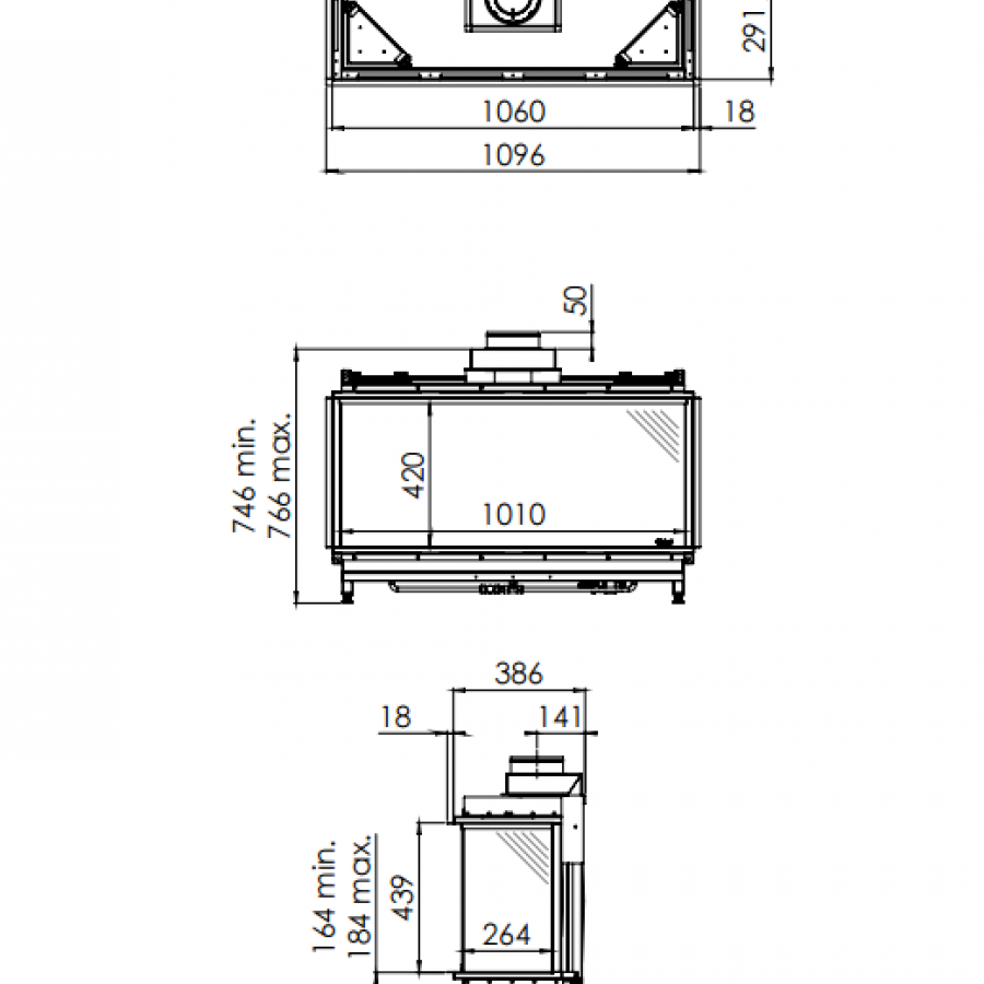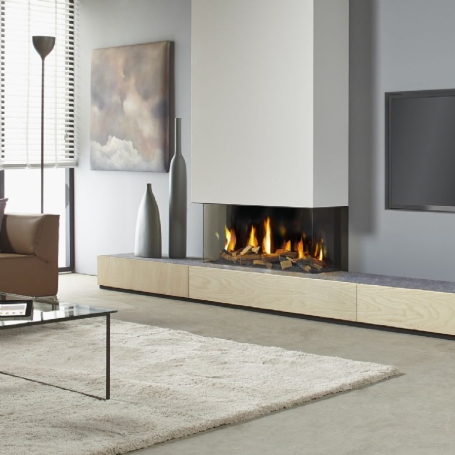 C'est un foyer à gaz d’un mètre de large avec une fenêtre à trois côtés offrant une vue imprenable sur les flammes. Des bûches, pierres ou verres anthracite sont disponibles. Les intérieurs livrables existent en noir ou Ceraglass vitrifié.