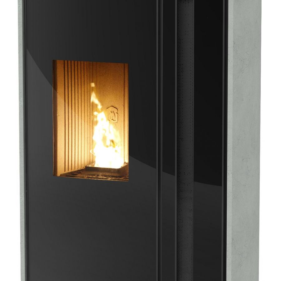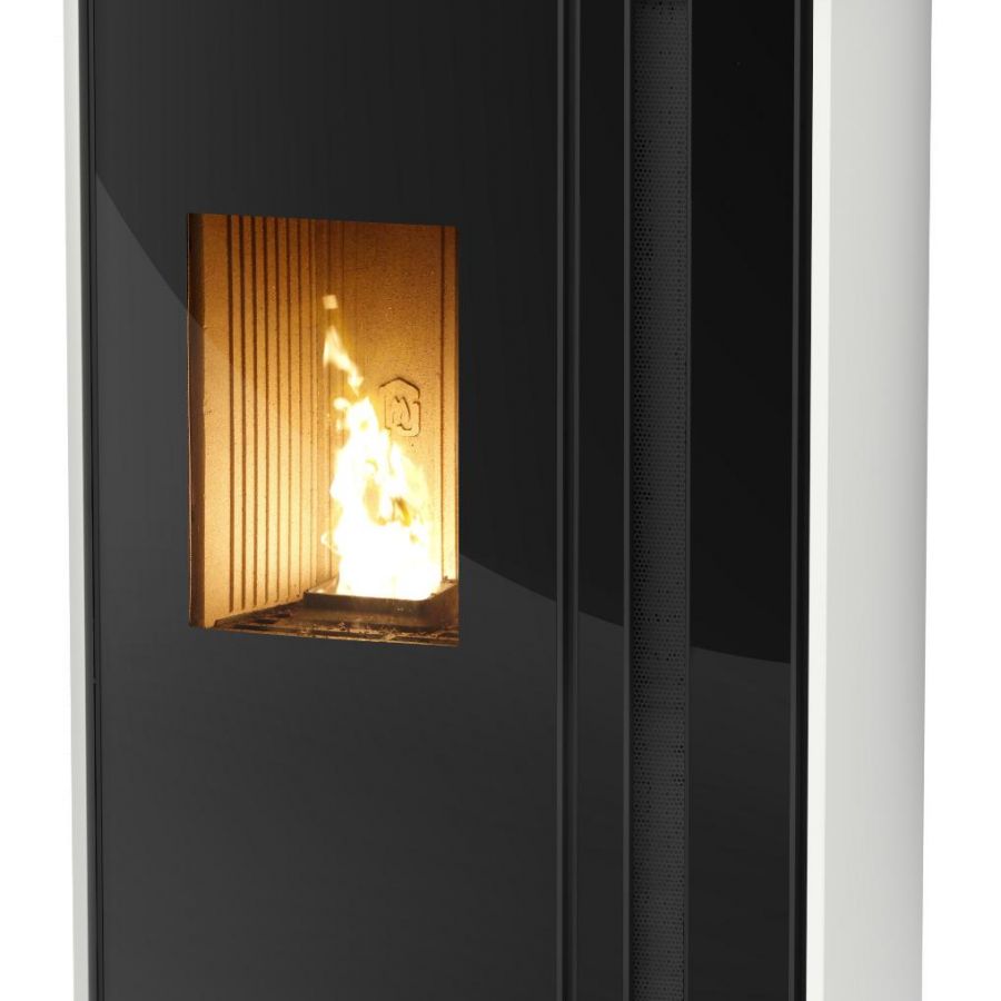 Le modèle de poêle à pellets Meltemi propose un système de soufflerie verticale, réglable et orientable.