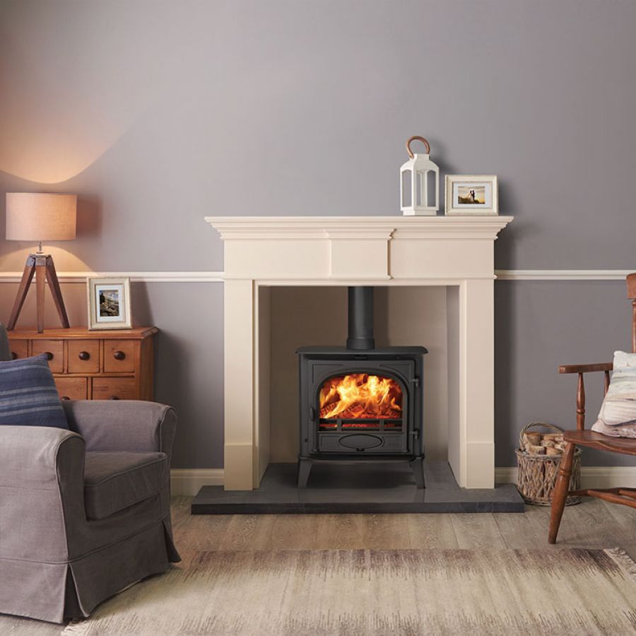 Le poêle à bois et multi-combustibles Stockton 5 Wide à grille fixe, conforme aux normes Ecodesign, offre une vue impressionnante sur les flammes grâce à sa chambre de combustion en format paysage et sa grande vitre.