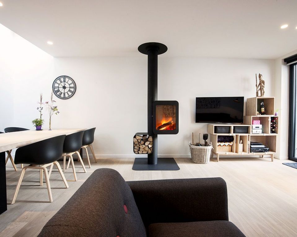 Le Grappus offre une vision panoramique des flammes, grâce à son design innovant qui intègre un présentoir à bois à proximité immédiate du foyer.