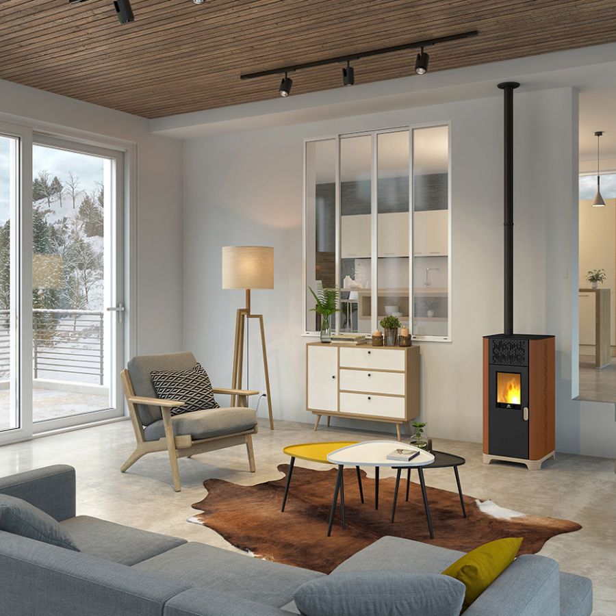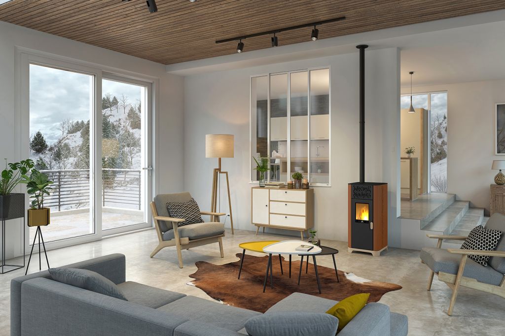 Son format vertical et sa large vitre offrent une vue imprenable sur les flammes, créant une ambiance chaleureuse et moderne. Ce poêle à granulés étanche, compatible RT 2012, est idéal pour les maisons bien isolées.
