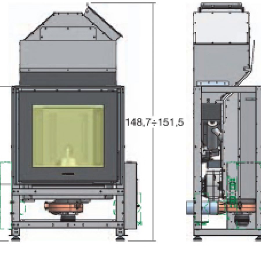 - Chauffage breveté Multifuoco System®, avec 2 ventilateurs pouvant fonctionner séparément, 4 vitesses de ventilation programmables, possibilité de fonctionnement avec programmation de la température ambiante relevée par la télécommande, bouche de sortie d’air chaud frontale en partie basse avec 2 déviateurs de flux, équipé de 2 sorties pour la distribution en partie arrière