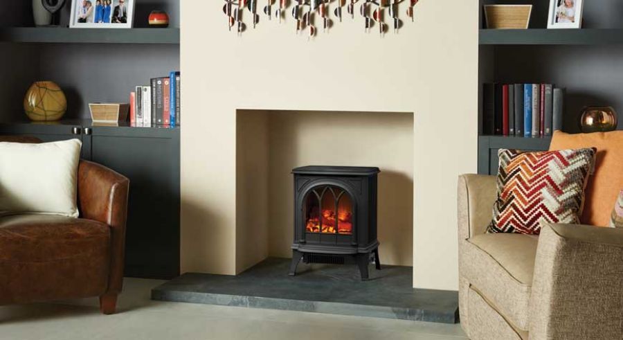 La version électrique du populaire poêle à gaz Huntingdon de Gazco est doté de lignes gracieuses et raffinées et d’une porte à moulures ogivales derrière laquelle l’effet bûche et braises rougeoyantes Vériflame™ captive le regard.