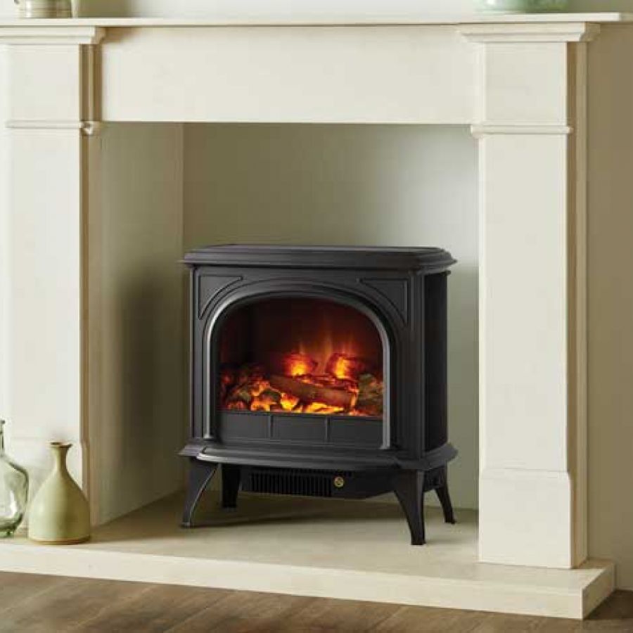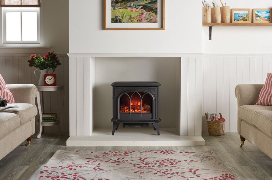 La version électrique du populaire poêle à gaz Huntingdon de Gazco est doté de lignes gracieuses et raffinées et d’une porte à moulures ogivales derrière laquelle l’effet bûche et braises rougeoyantes Vériflame™ captive le regard.