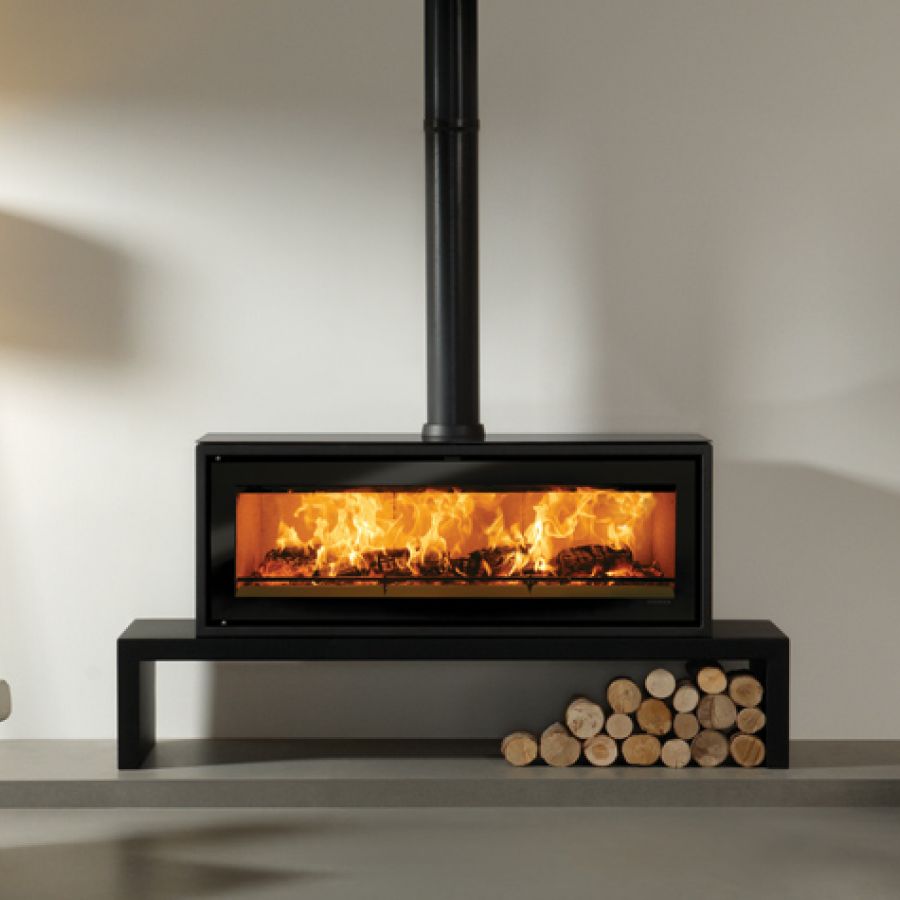 Le frappant poêle à bois Studio 3 Freestanding de Stovax est le plus grand modèle de la gamme. Efficace et imposant, il peut atteindre une puissance calorifique de 11kW, tout comme l’insert à bois Studio 3 dont il possède également la même vision panoramique tout en ayant un style bien distinct.
